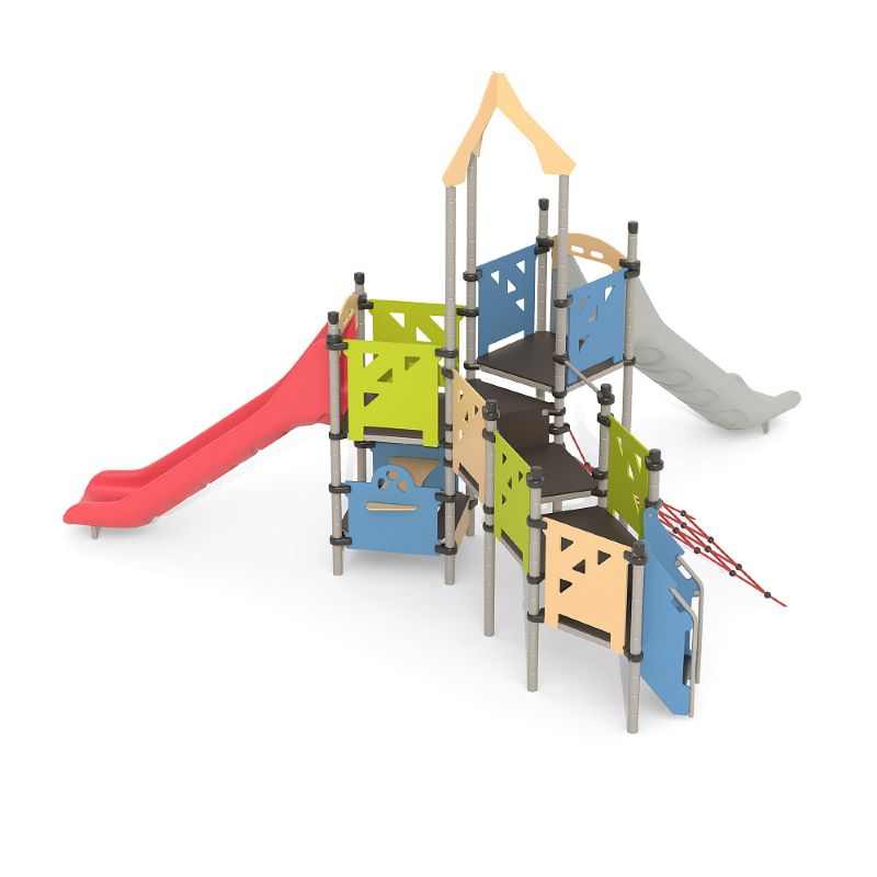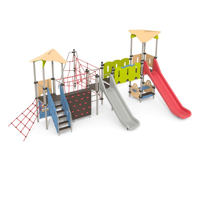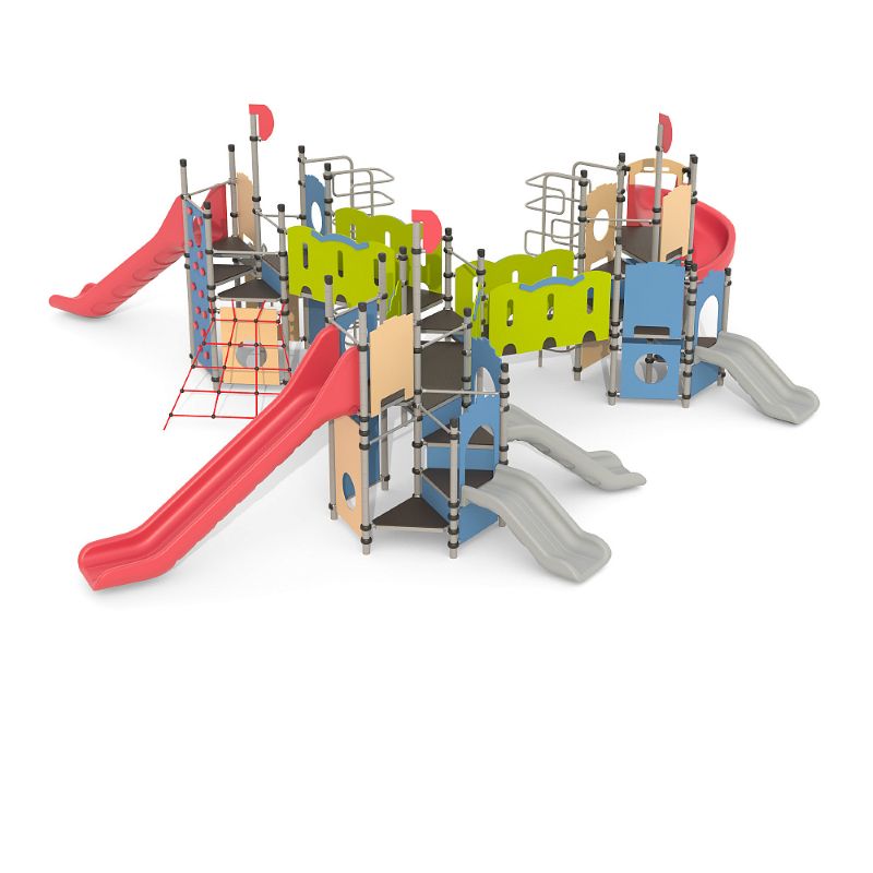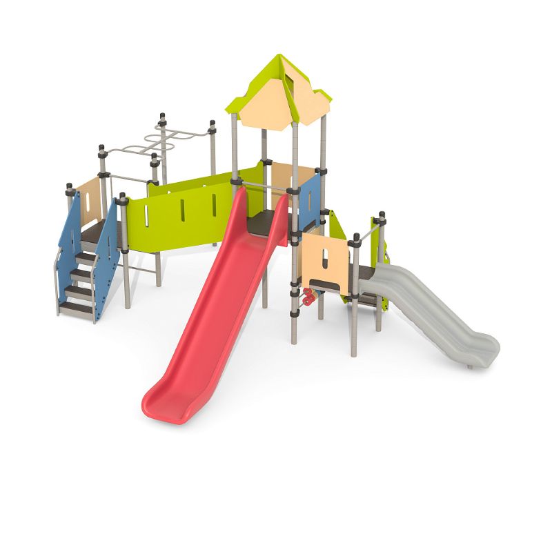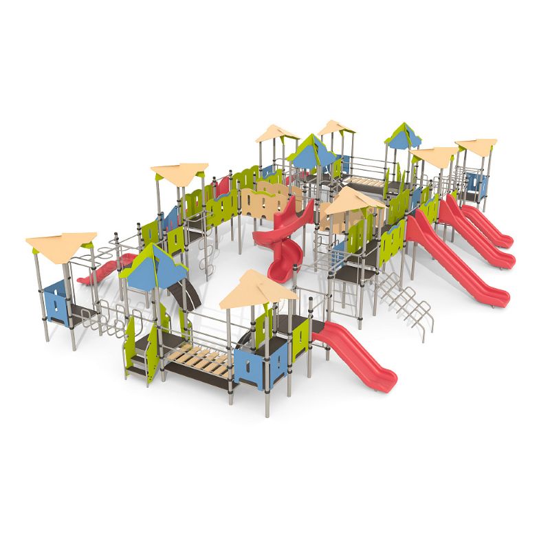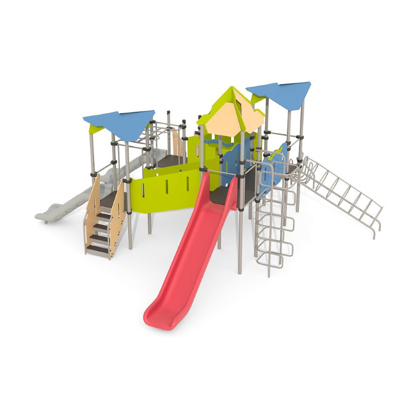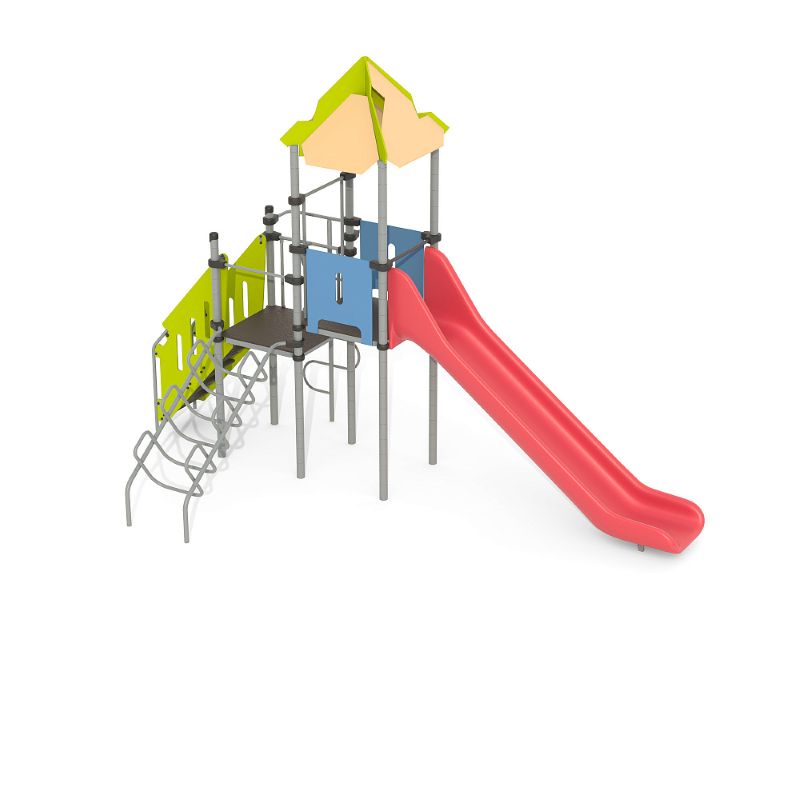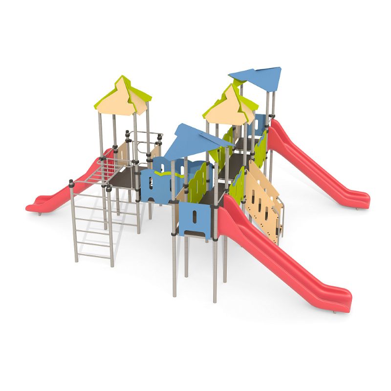 Игровые комплексы серии ИК 101 – это оборудование для детских площадок на металлических опорных конструкциях с разноуровневыми горками выполненными из цельного листа нержавеющей стали, толщиной 1,5 мм. Элементы крыши выполнены из водостойкой шлифованной березовой фанеры, окрашены профессиональными красками в заводских условиях. Ступени, переходы и площадки выполнены из фанеры с высокой водо- и износостойкостью, с антискользящим покрытием. Металлические детали окрашены полиэфирными красками, обеспечивающими устойчивость к неблагоприятным погодным условиям. Деревянные детали выполнены из водостойкой шлифованной березовой фанеры, окрашены профессиональными красками в заводских условиях. Все крепежные элементы оцинкованы, закрыты пластиковыми колпачками. В игровых комплексах применены материалы, не оказывающие вредное воздействие на здоровье ребенка. Все комплектующие и материалы имеют сертификаты и Санитарно- эпидемиологические заключения.