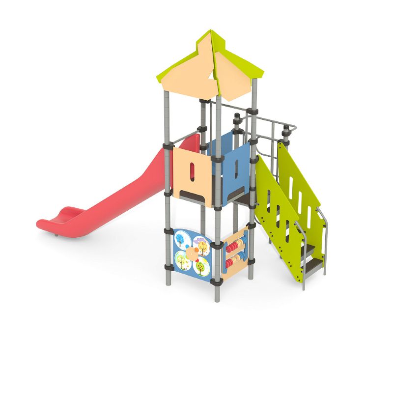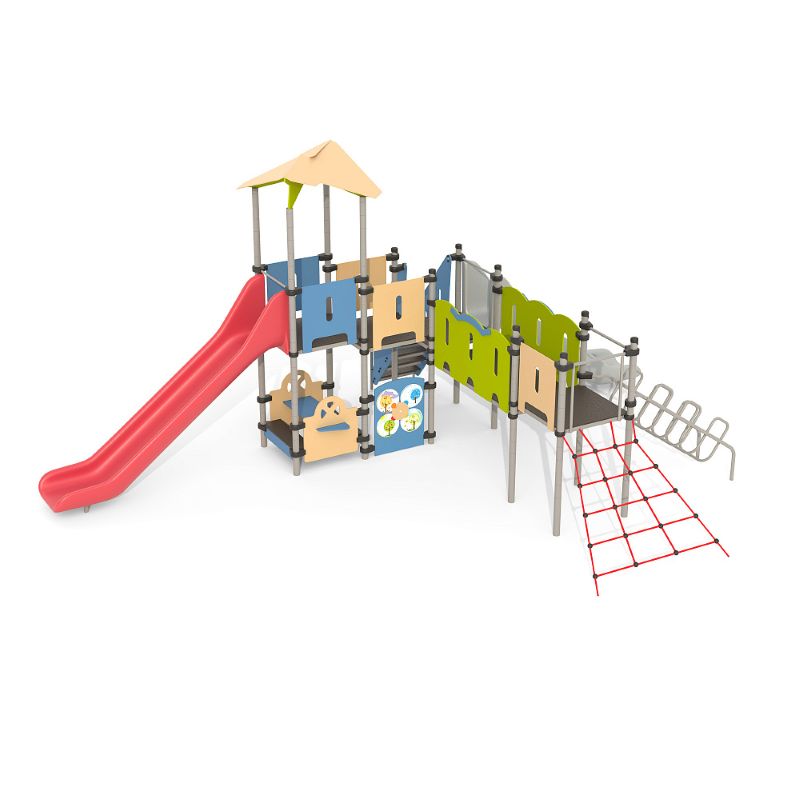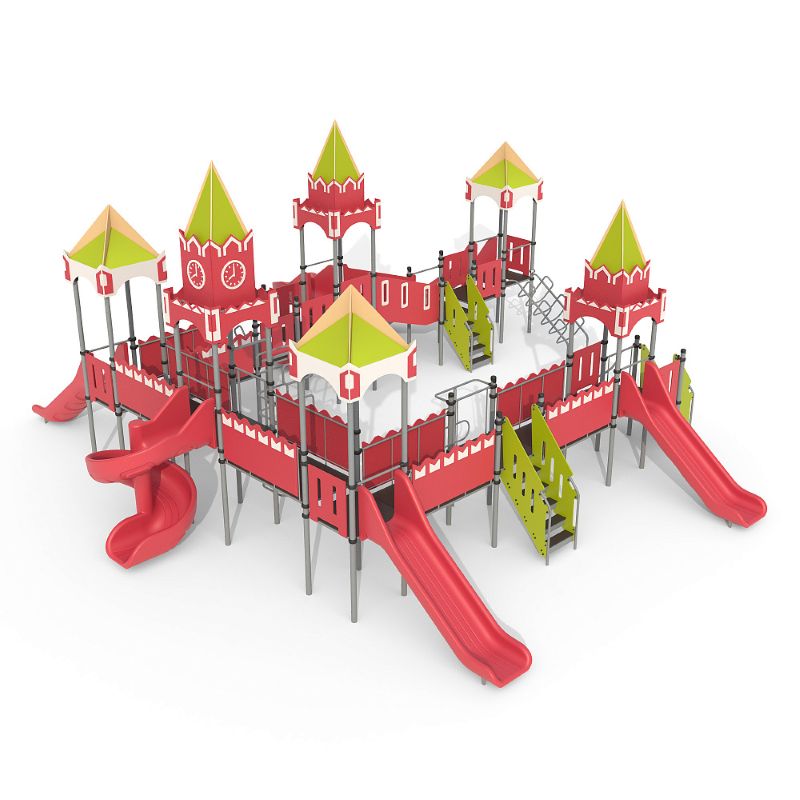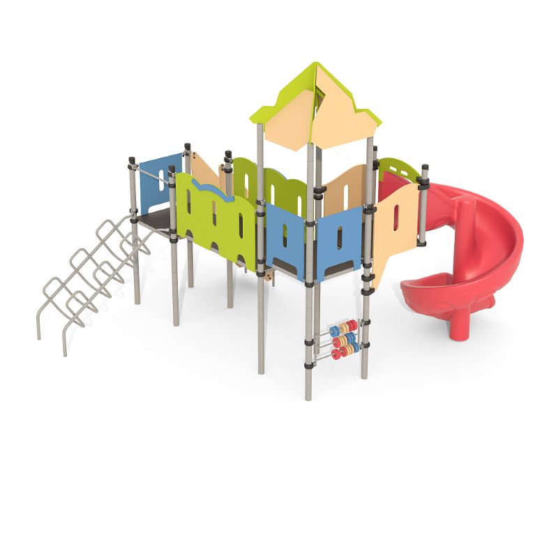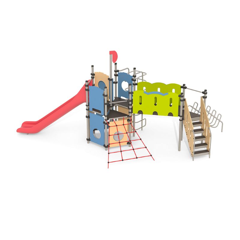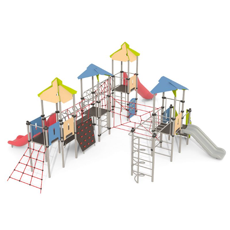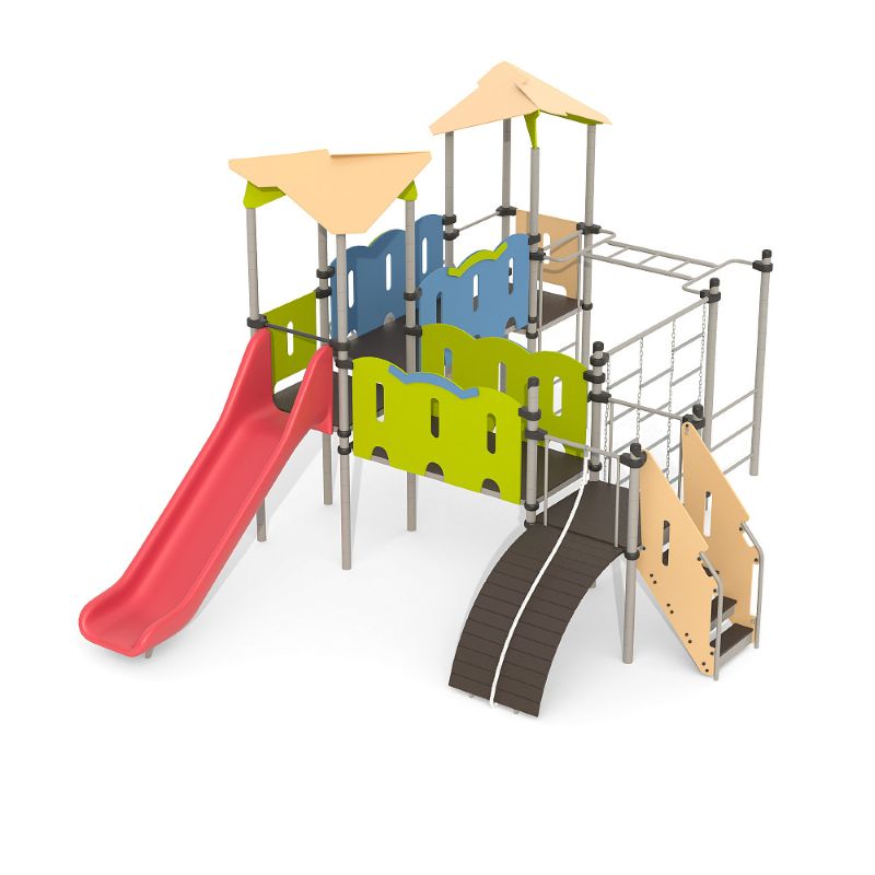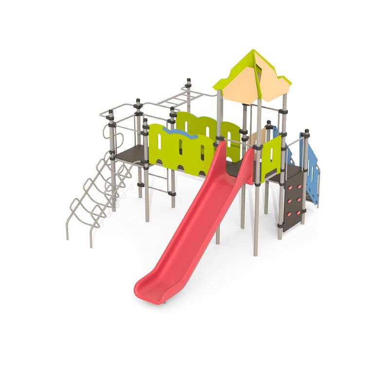Игровые комплексы серии ИК 101 – это оборудование для детских площадок на металлических опорных конструкциях с разноуровневыми горками выполненными из цельного листа нержавеющей стали, толщиной 1,5 мм. Элементы крыши выполнены из водостойкой шлифованной березовой фанеры, окрашены профессиональными красками в заводских условиях. Ступени, переходы и площадки выполнены из фанеры с высокой водо- и износостойкостью, с антискользящим покрытием. Металлические детали окрашены полиэфирными красками, обеспечивающими устойчивость к неблагоприятным погодным условиям. Деревянные детали выполнены из водостойкой шлифованной березовой фанеры, окрашены профессиональными красками в заводских условиях. Все крепежные элементы оцинкованы, закрыты пластиковыми колпачками. В игровых комплексах применены материалы, не оказывающие вредное воздействие на здоровье ребенка. Все комплектующие и материалы имеют сертификаты и Санитарно- эпидемиологические заключения.