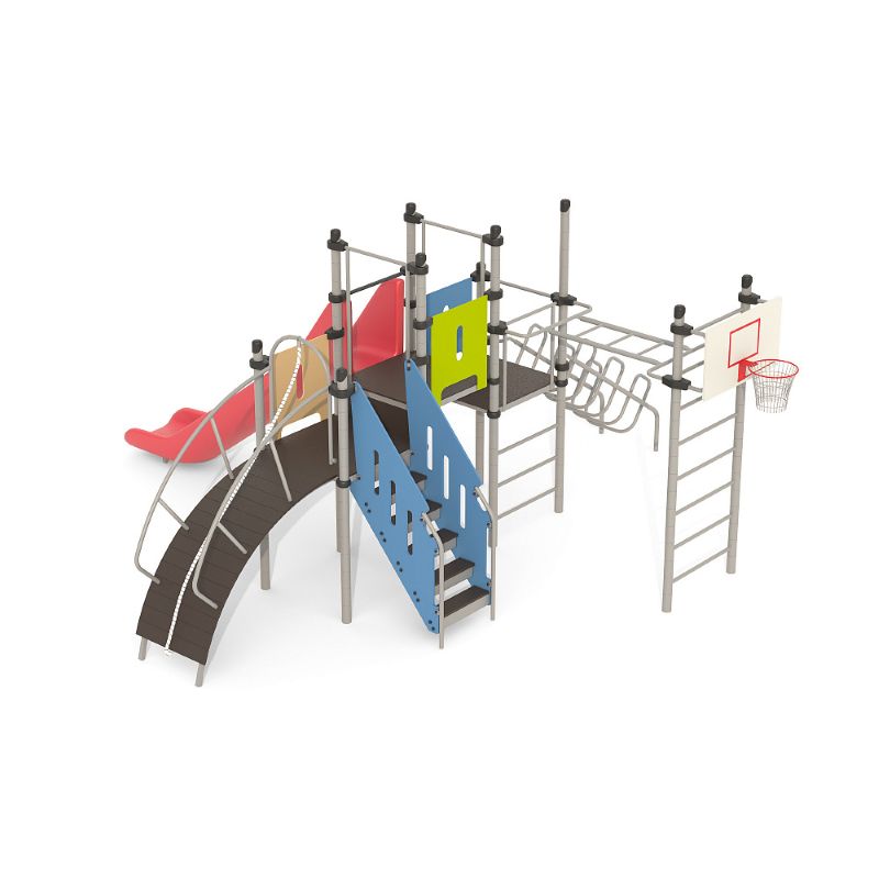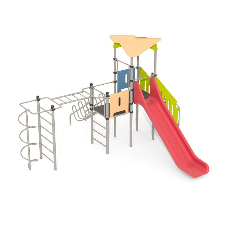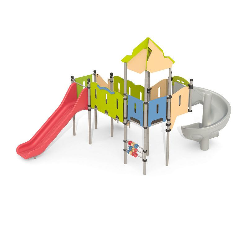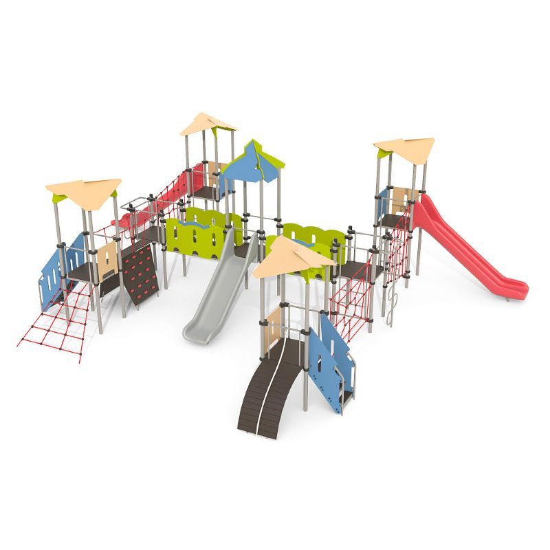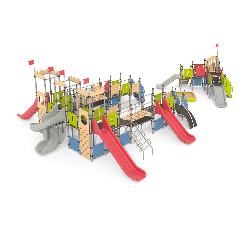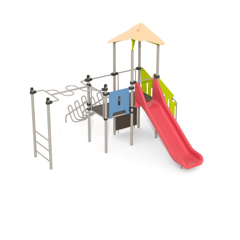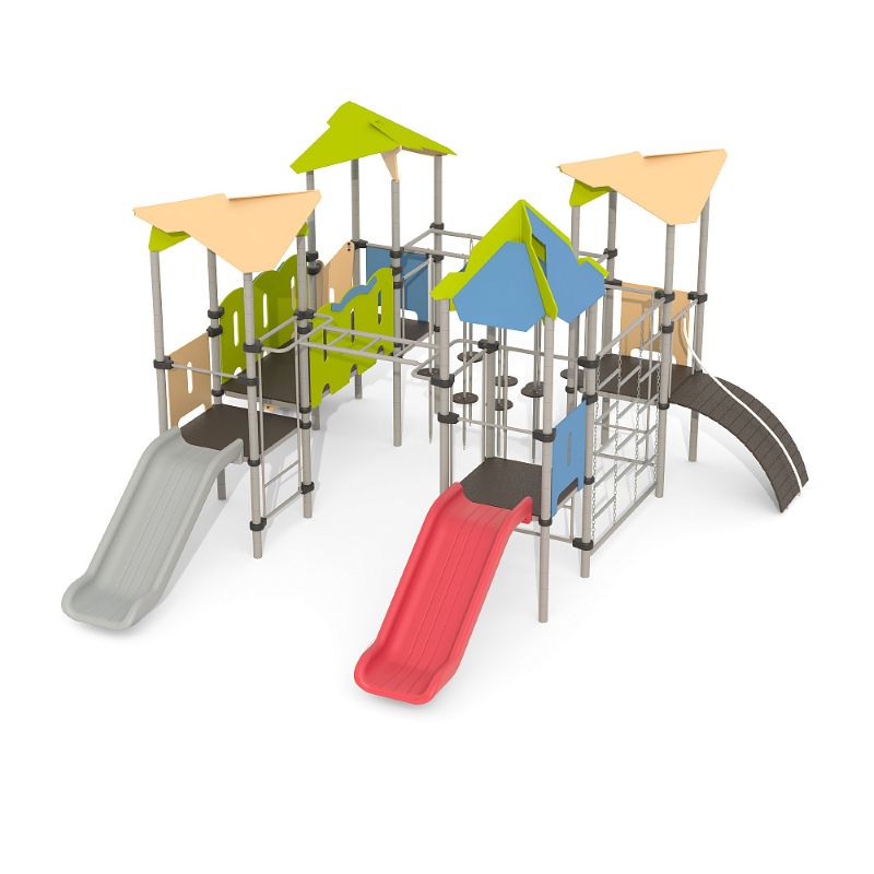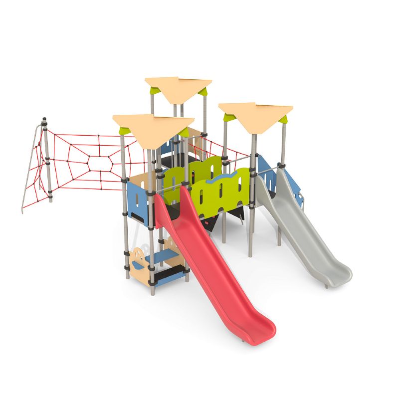 Игровые комплексы серии ИК 101 – это оборудование для детских площадок на металлических опорных конструкциях с разноуровневыми горками выполненными из цельного листа нержавеющей стали, толщиной 1,5 мм. Элементы крыши выполнены из водостойкой шлифованной березовой фанеры, окрашены профессиональными красками в заводских условиях. Ступени, переходы и площадки выполнены из фанеры с высокой водо- и износостойкостью, с антискользящим покрытием. Металлические детали окрашены полиэфирными красками, обеспечивающими устойчивость к неблагоприятным погодным условиям. Деревянные детали выполнены из водостойкой шлифованной березовой фанеры, окрашены профессиональными красками в заводских условиях. Все крепежные элементы оцинкованы, закрыты пластиковыми колпачками. В игровых комплексах применены материалы, не оказывающие вредное воздействие на здоровье ребенка. Все комплектующие и материалы имеют сертификаты и Санитарно- эпидемиологические заключения.
