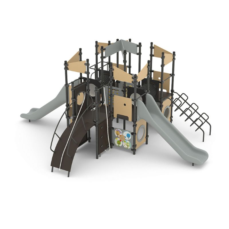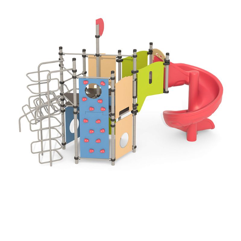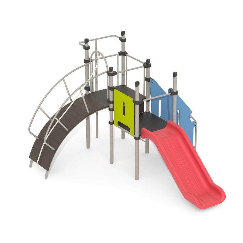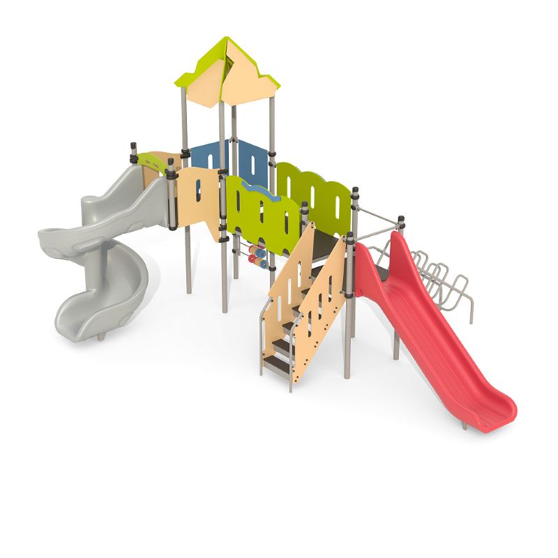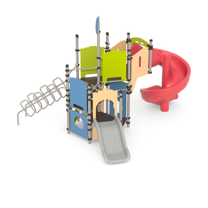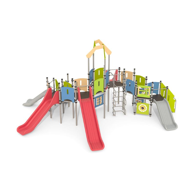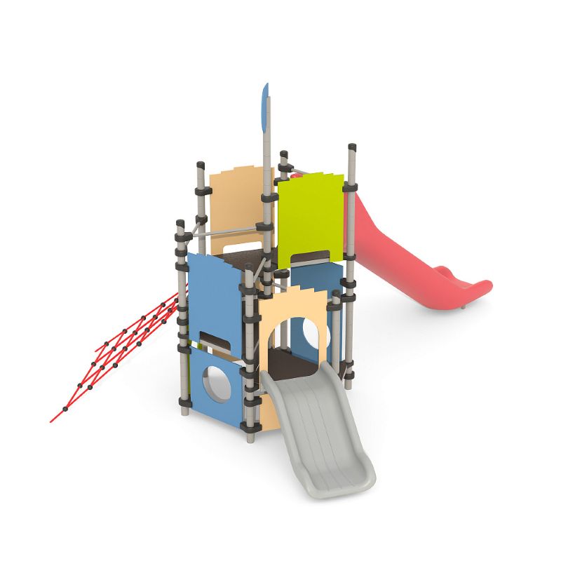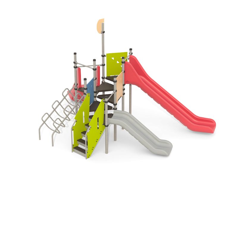 Игровые комплексы серии ИК 101 – это оборудование для детских площадок на металлических опорных конструкциях с разноуровневыми горками выполненными из цельного листа нержавеющей стали, толщиной 1,5 мм. Элементы крыши выполнены из водостойкой шлифованной березовой фанеры, окрашены профессиональными красками в заводских условиях. Ступени, переходы и площадки выполнены из фанеры с высокой водо- и износостойкостью, с антискользящим покрытием. Металлические детали окрашены полиэфирными красками, обеспечивающими устойчивость к неблагоприятным погодным условиям. Деревянные детали выполнены из водостойкой шлифованной березовой фанеры, окрашены профессиональными красками в заводских условиях. Все крепежные элементы оцинкованы, закрыты пластиковыми колпачками. В игровых комплексах применены материалы, не оказывающие вредное воздействие на здоровье ребенка. Все комплектующие и материалы имеют сертификаты и Санитарно- эпидемиологические заключения.